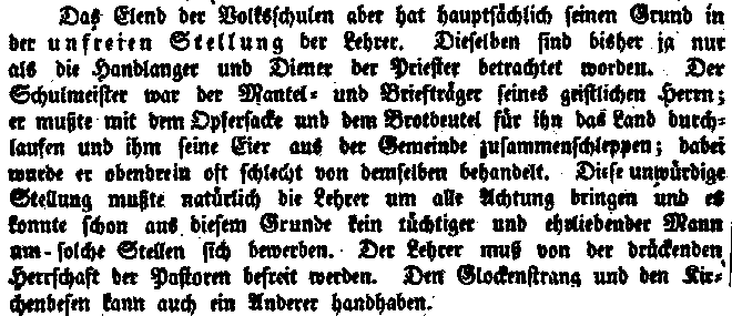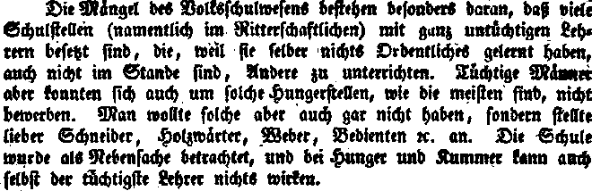 Damit man halbwegs die Bedingungen und Ursachen für die zu Recht geschilderten schlechten allgmeinen Zustände erfassen kann, sei noch folgende Bemerkung gestattet. Das ritter-und landschaftliche Landschulwesen in unserem Mecklenburg war Teil des Volksschulwesens, nämlich desjenigen Teils, welcher getrennt von dem Schulwesen in den Großherzoglichen Domänen, dem Domanialschulwesen war. Seit der Gültigkeit des Landesgrundgesetzlichen Erbvergleichs LGGEV von 1755 untersteht dieser Teil der Schulverwaltung den Gutsobrigkeiten und den Klöstern. Seit dieser Zeit nahmen die Verhältnisse hier eine eigenartige, besondere Entwicklung, die bis 1919 fortdauern sollte. Die politische Dreiteilung Mecklenburgs in städtisches, domaniales und ritterschaftliches Grund-und Rechtsgebiet, gab mit der landständischen Verfassung, in der die Stände als Grundbesitzer selbst alle obrigkeitslichen Rechte über ihre Hintersassen ausübten, die Richtung vor. Damit war die Gestaltung des Schulwesens dem weitgehendst idividuellen Einflußbereich der Gutsherren ausgeliefert, zumal durch diese wenig oder keine landesherrlichen Regelungen zugelassen wurden. Wie wenig diese Bedingungen für das Land von Segen waren, äußerte sich in den Aus-und Einlassungen der Delegierten.