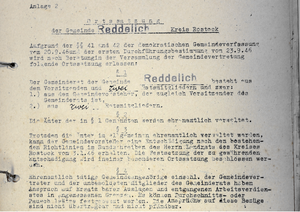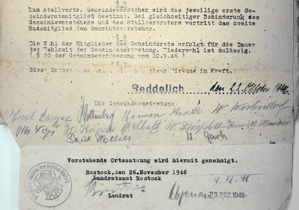 Am 22. Oktober 1946 beschloss die damalige Gemeindevertretung von Reddelich eine Ortssatzung. Darin war die Zusammensetzung des Gemeinderates und dessen Entschädigungen geregelt. Als Gemeindevertreter unterschrieben das Dokument: Carl Dreyer, Friedrich Wilhelm Wollenberg, Hermann Bannow, Otto Kruth, Wilhelm Westendorf, Otto Voss, Heinrich Köpcke, Otto Schultz, Wilhelm Schönfeldt, Heinrich Mamerow, Paul Hallier und Albrecht Garbe.
